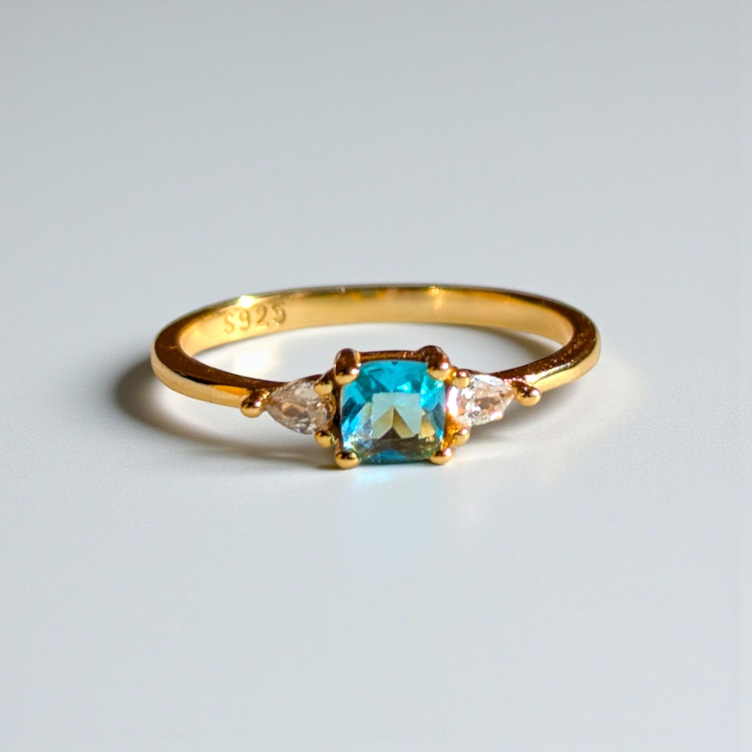 Symbole d’élégance intemporelle, la bague Éclat d’Azur capture la lumière dans un jeu subtil de contrastes. Son zircon bleu taille émeraude, encadré de deux zircons blancs en forme de goutte, évoque la clarté d’un ciel d’été au-dessus de la mer. Montée sur une fine bague en argent 925 plaqué or 18K, elle allie délicatesse et éclat précieux pour sublimer chaque geste.