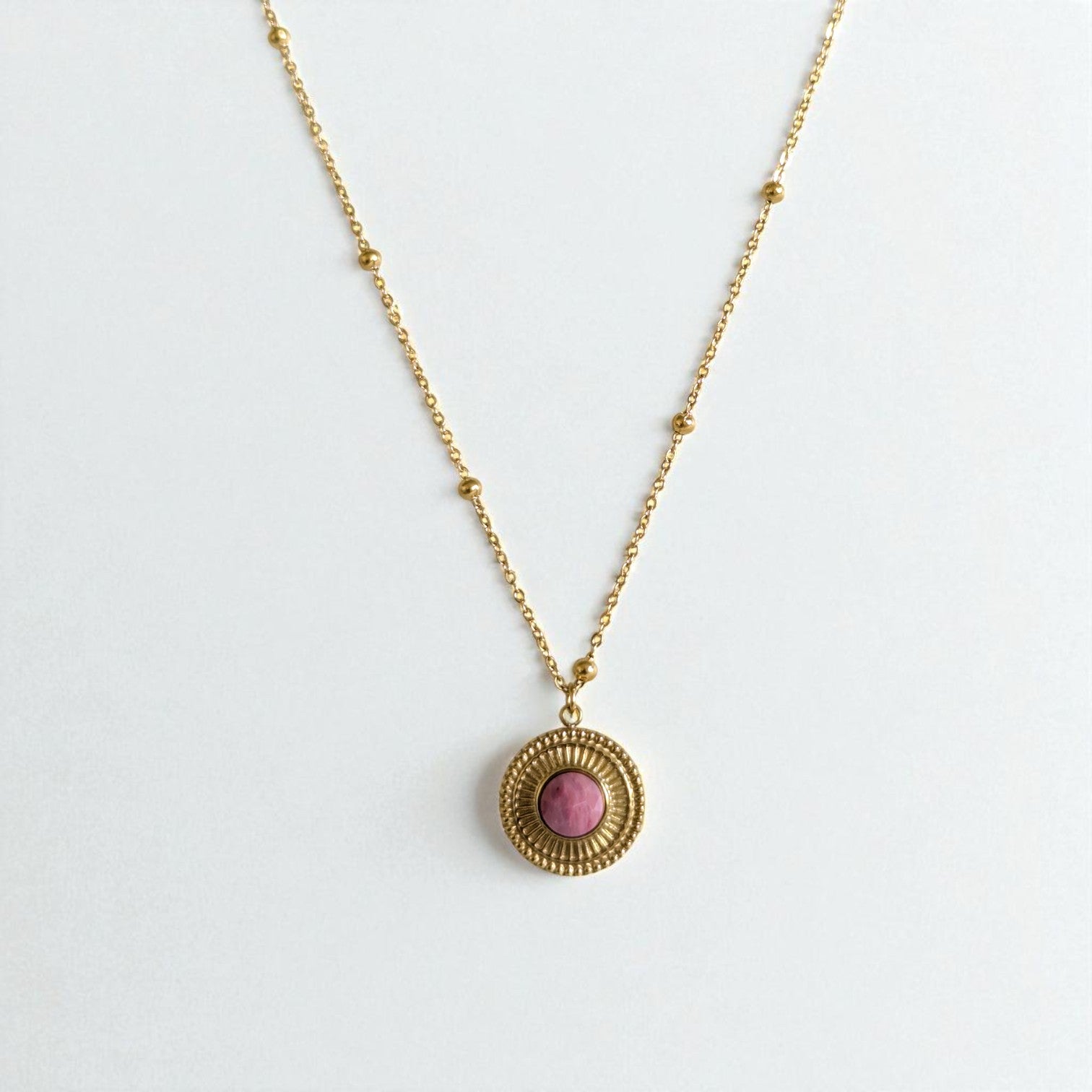 Évocation des îles de granit rose : un médaillon texturé, doré et lumineux, qui enlace une rhodonite naturelle aux nuances framboisées. La chaîne perlée apporte un rythme discret, entre éclat solaire et douceur minérale.