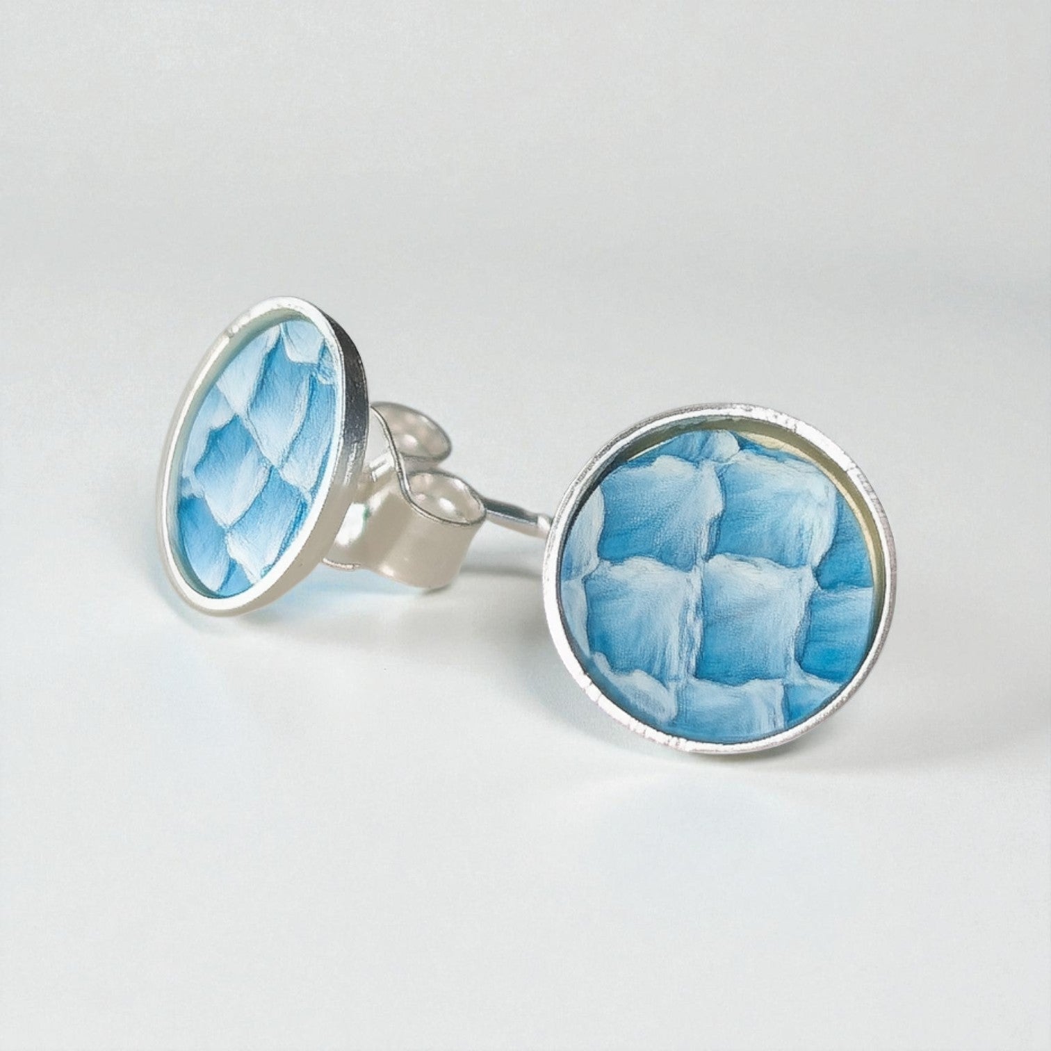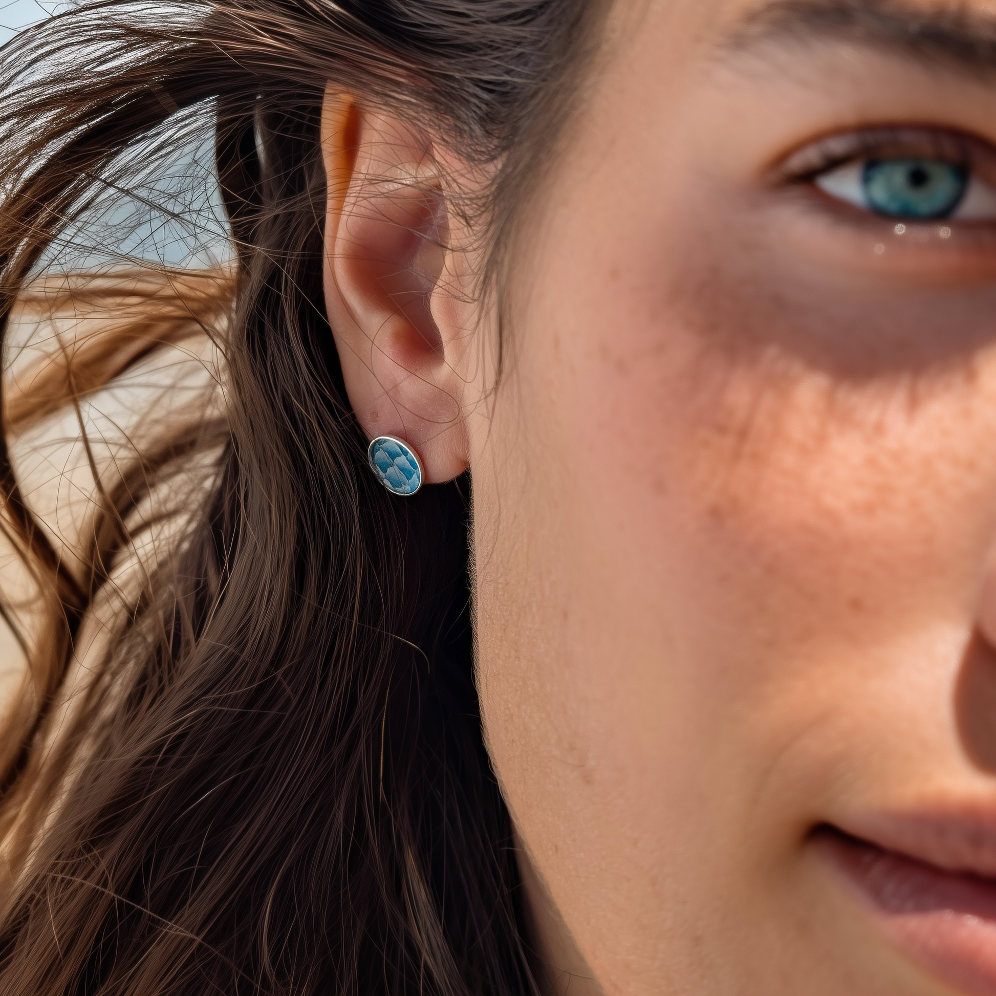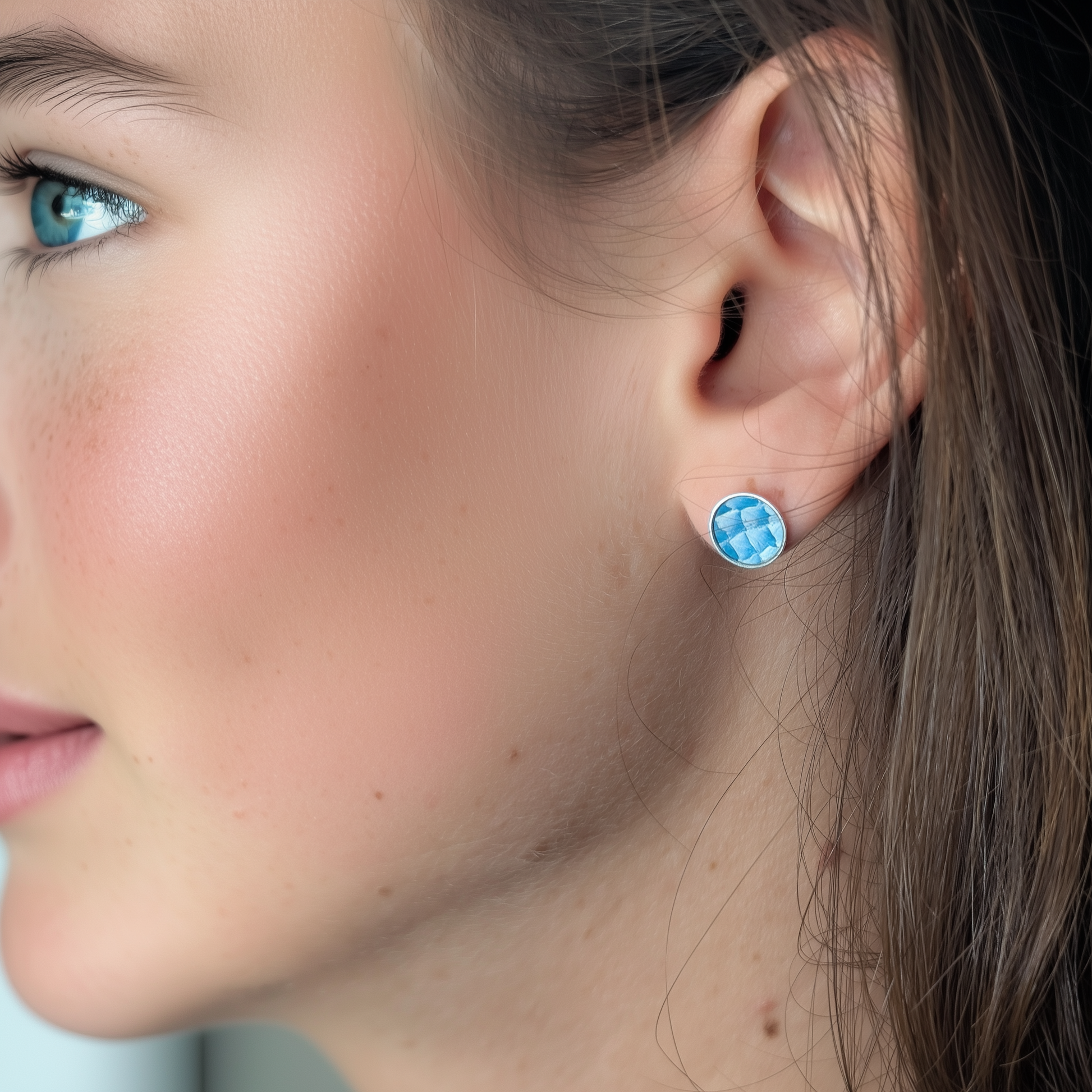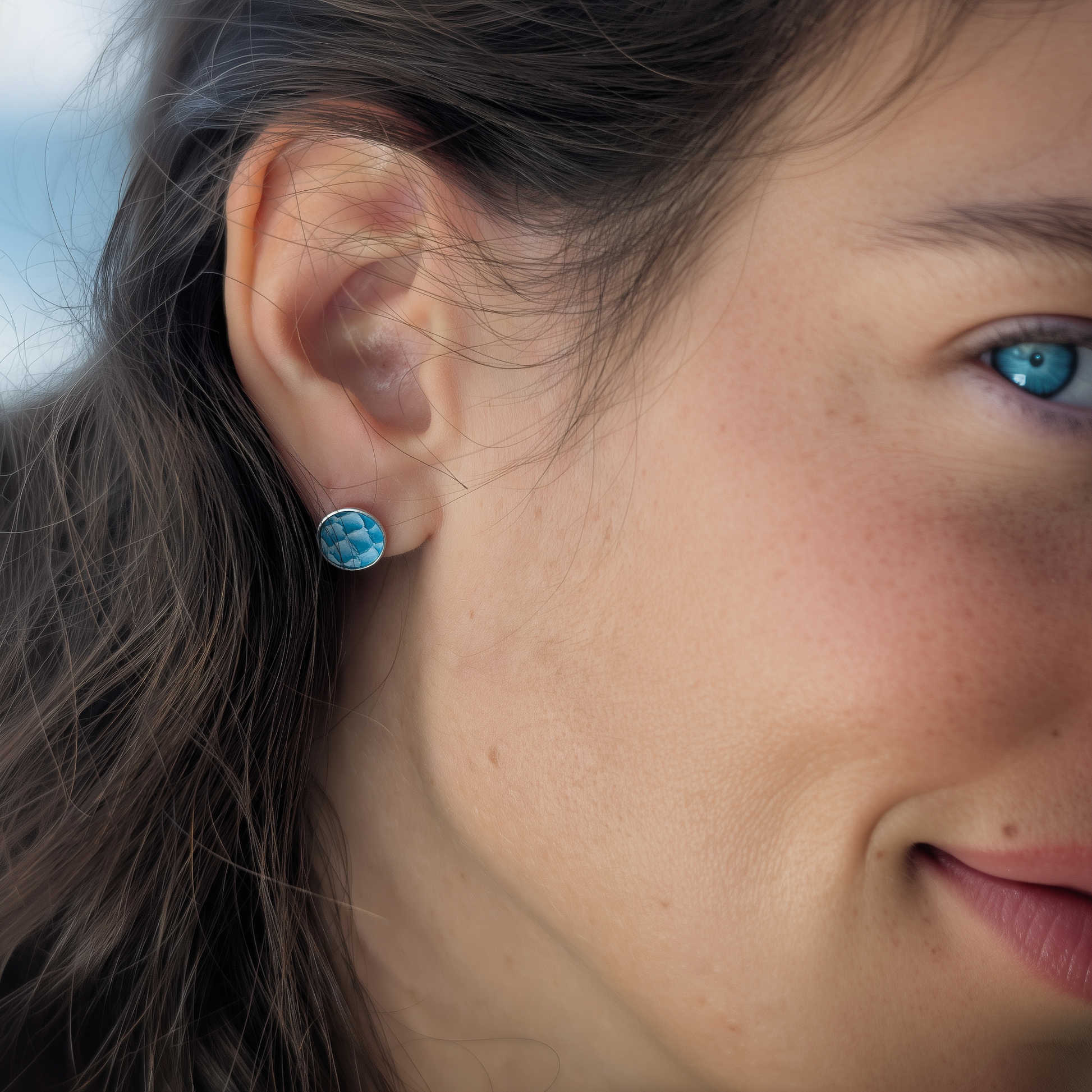 Montées sur clous en argent 925, chaque paire révèle un éclat unique, oscillant entre azur et argent, comme les vagues sous un ciel d’hiver.