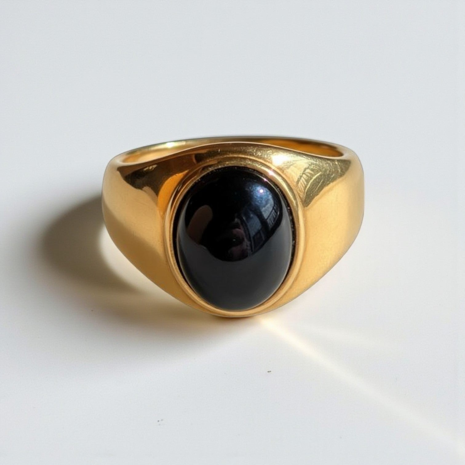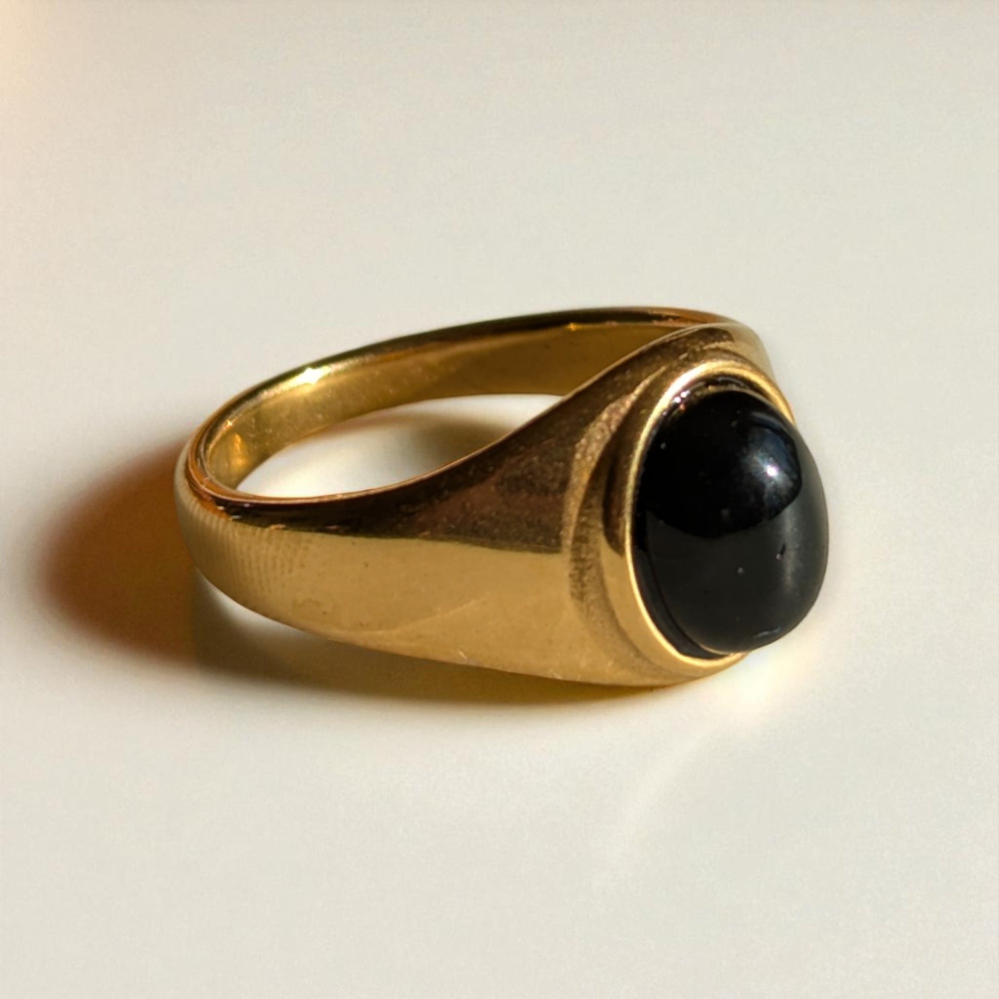 Avec sa pierre noire ovale incrustée dans un or lisse et massif, cette bague assume un design franc, presque brutal.