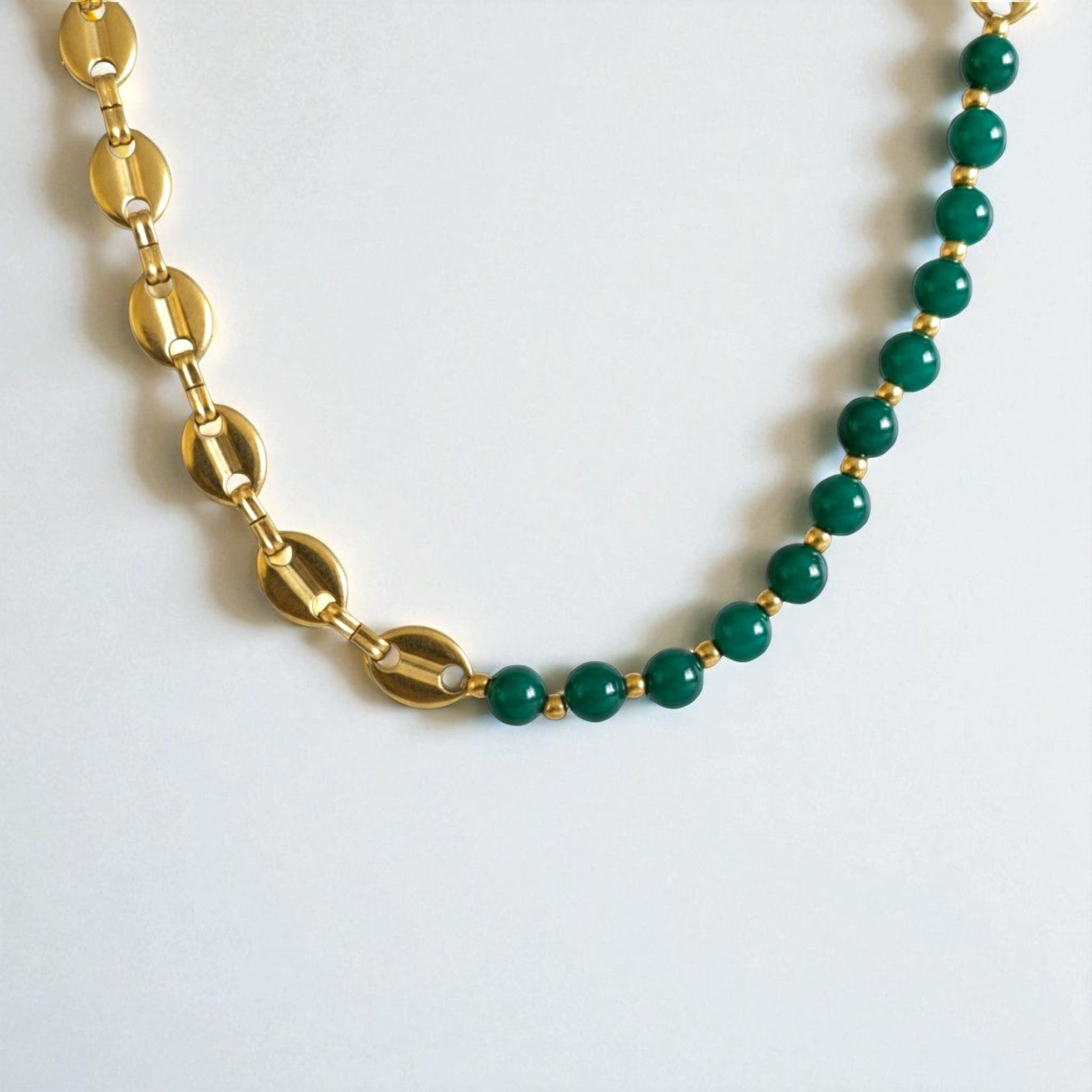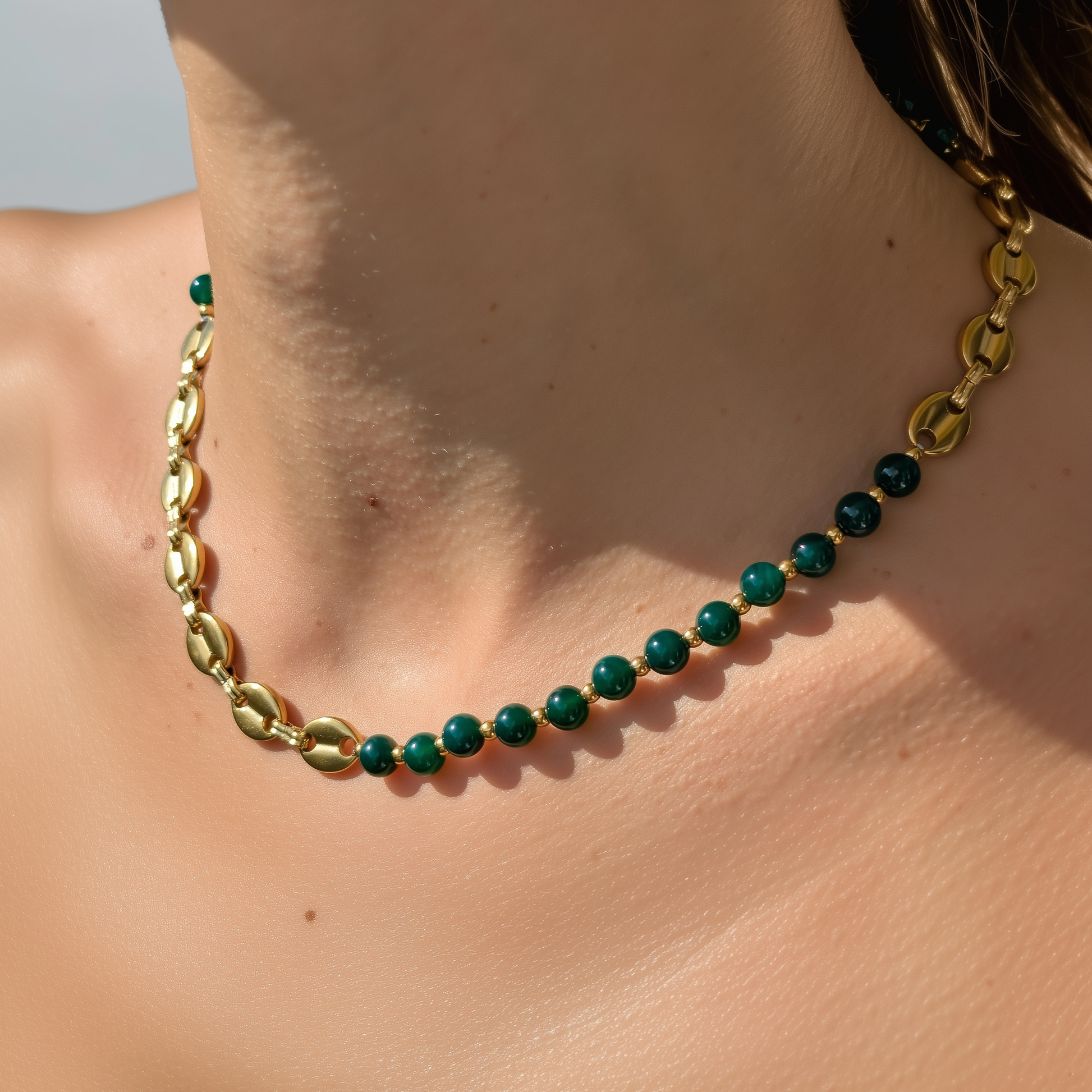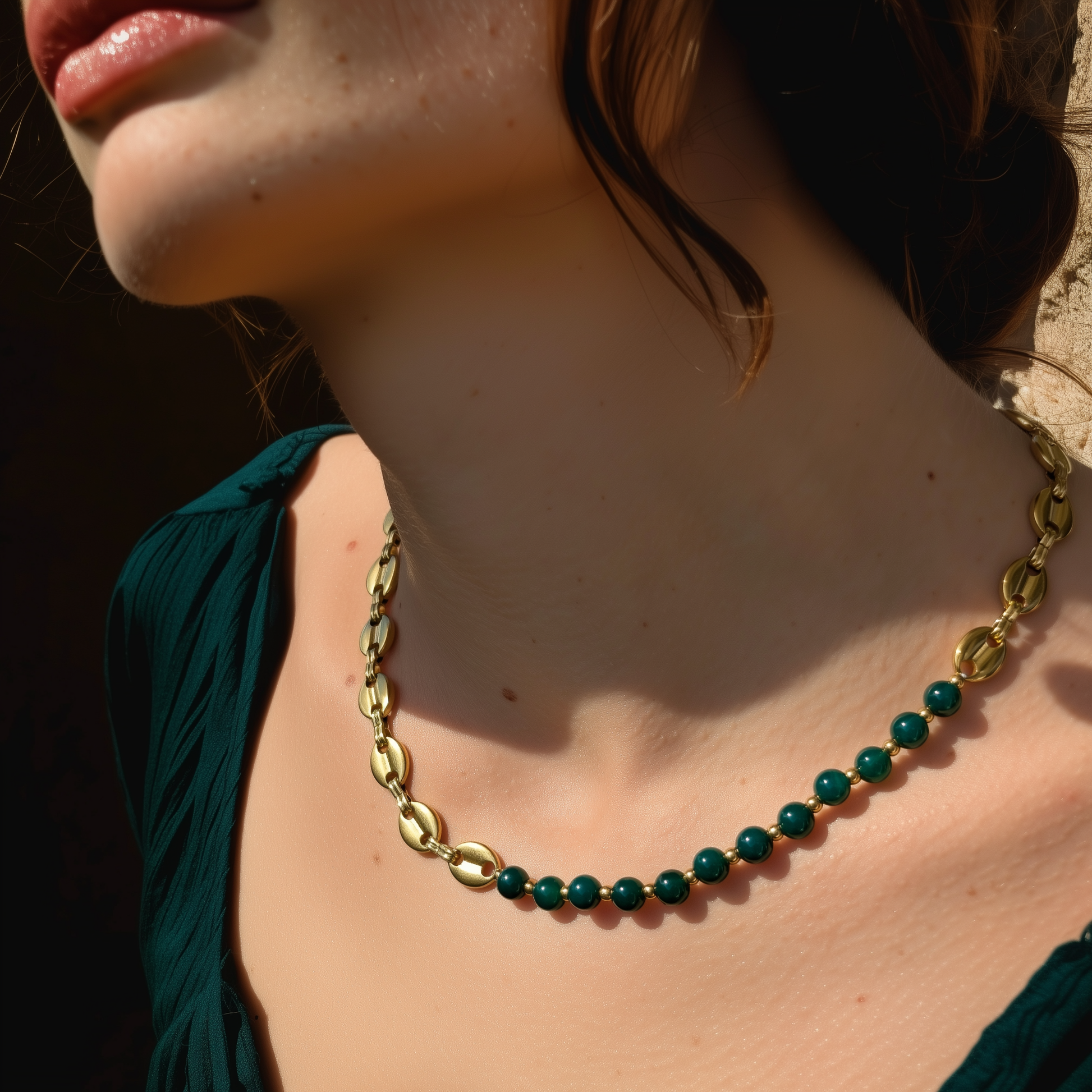 Le collier Jade Torréfiée puise dans la chaleur du soleil et la profondeur des terres. Les perles de pierres naturelles vertes évoquent les forêts côtières bretonnes baignées d’embruns, tandis que les maillons dorés façon "grains de café" rappellent les grains fraîchement torréfiés d’un café raffiné.