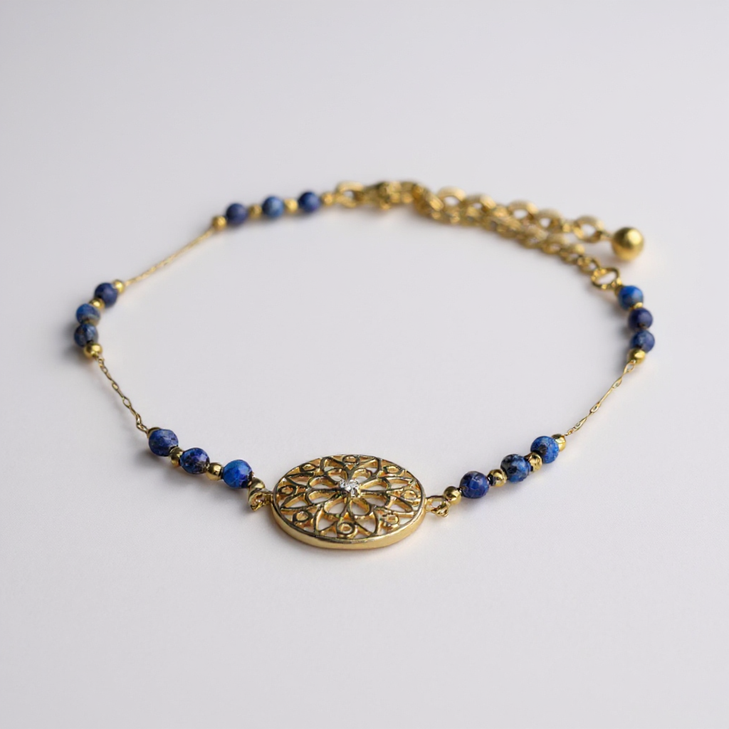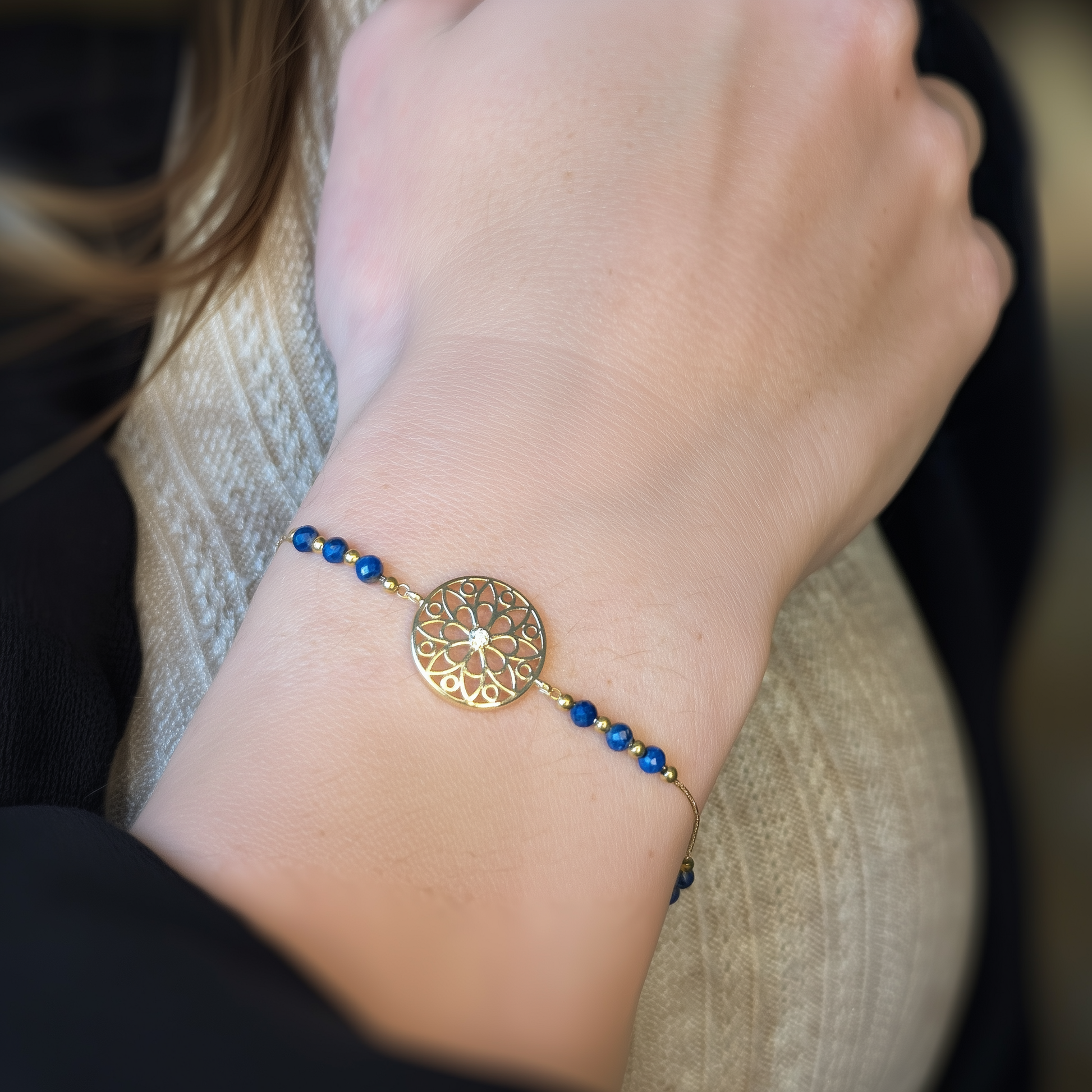 Autour, le lapis lazuli naturel déploie un bleu profond, subtilement strié d’éclats dorés uniques, comme l’horizon qui se fond au ciel.
